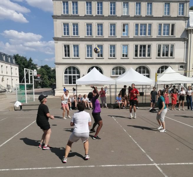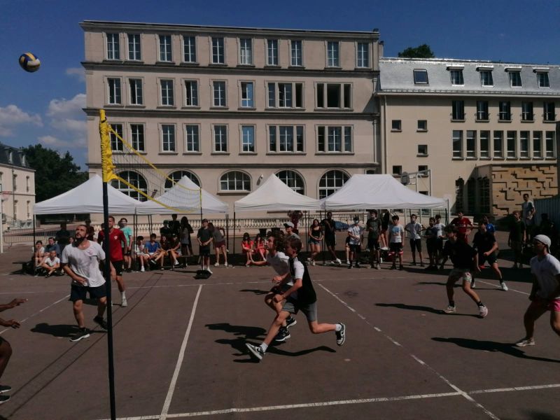 Une formule championnat avec 2 grand terrains, un dans le gymnase n’accueillant aucun public, compte tenu des contraintes et un terrain central dans la cour au milieu de l’ensemble des élèves et de leurs animations festives.
