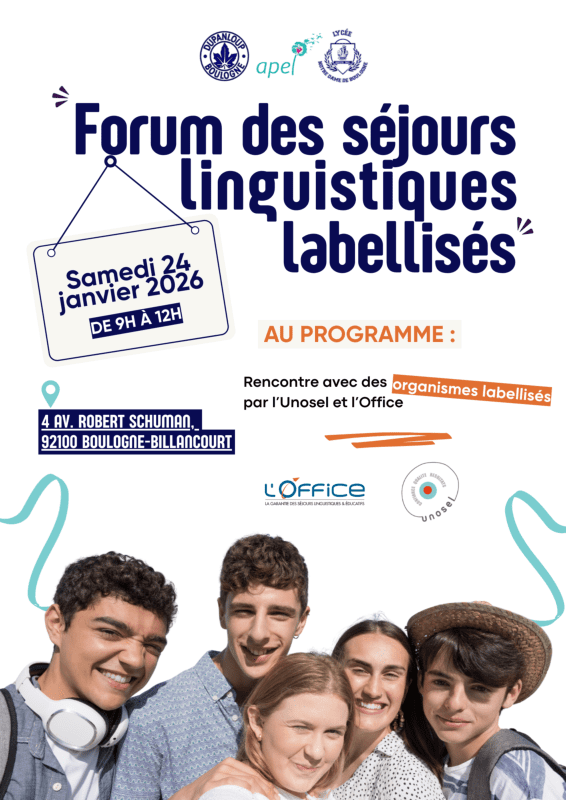 L’APEL Dupanloup et le Collège Dupanloup vous invitent au Forum des séjours linguistiques qui se déroulera le samedi 24 janvier 2026 de 9h00 à 12h00 au sein du Collège.
