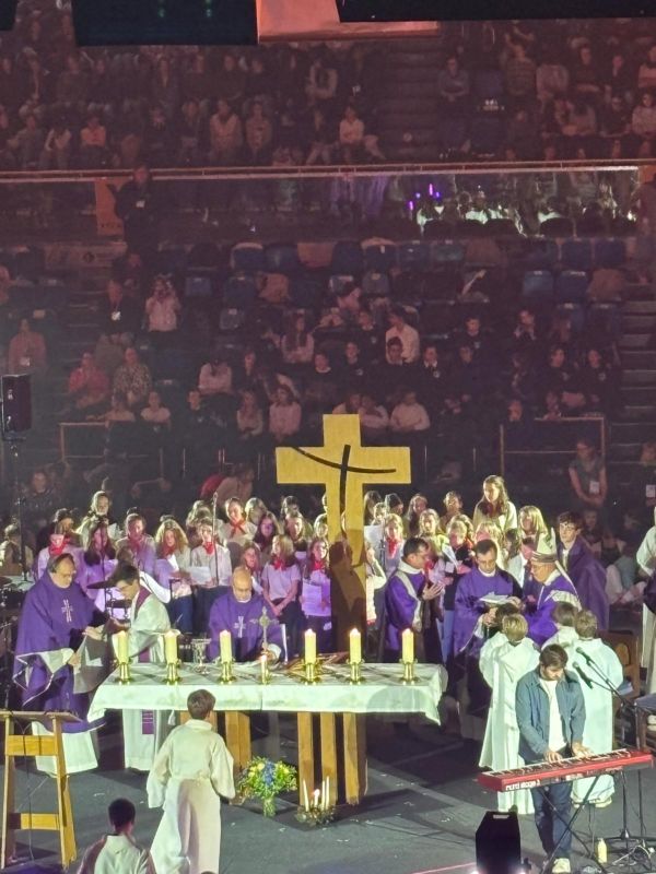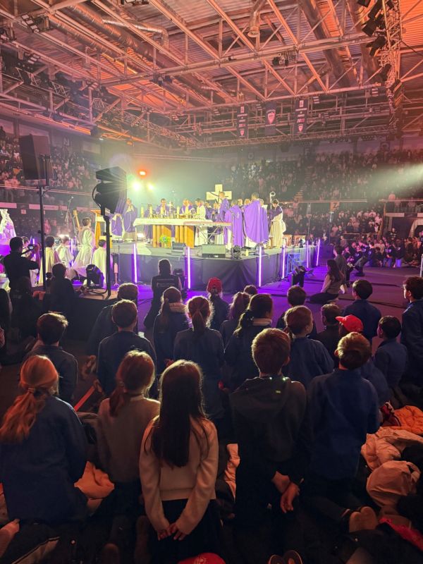 Des écoliers et collégiens ont participé vendredi au grand rassemblement de l’enseignement catholique du 92. Dans une ambiance survoltée ils ont assisté à un magnifique spectacle sur le thème de l’espérance et à  la messe jubilaire célébrée par notre Évêque. 14 d’entre eux ont eu la joie de chanter durant la messe.