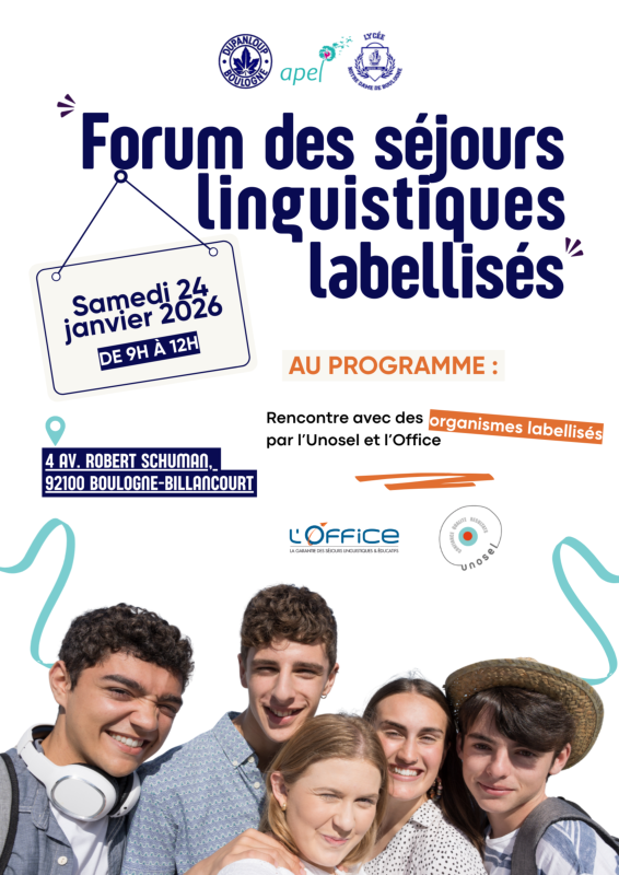 L'APEL Dupanloup et le Collège Dupanloup vous invitent au Forum des séjours linguistiques qui se déroulera le samedi 24 janvier 2026 de 9h00 à 12h00 au sein du Collège.